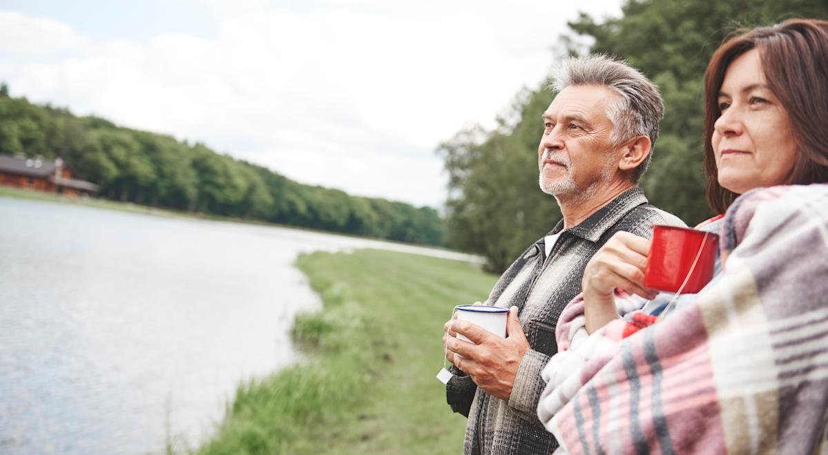 Near-retirement couple drinking tea outside on a trip