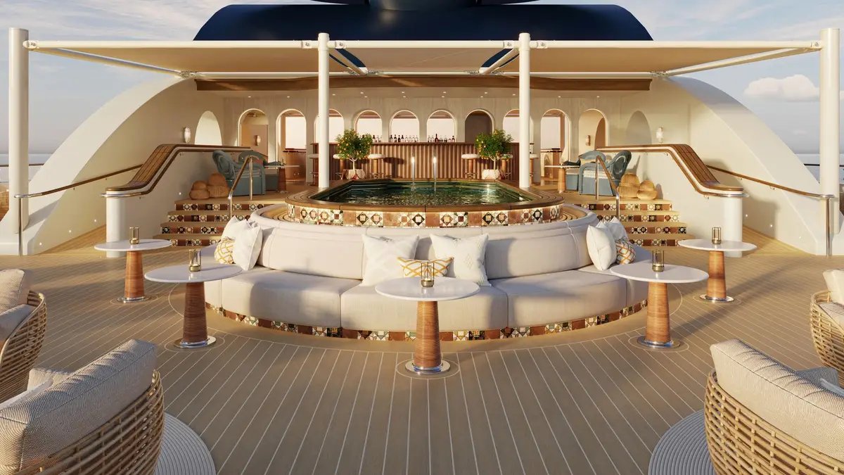 The yacht’s L’Oceana Spa features a thermal circuit with hydrothermal and contrast therapies including infrared saunas, hammam rituals, cryotherapy and cold plunges, all with uninterrupted ocean views.